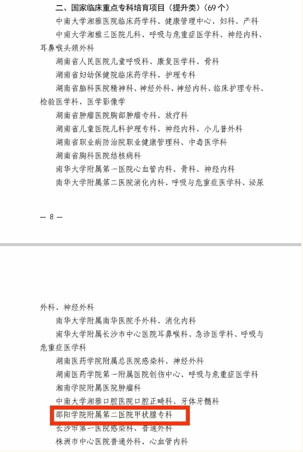 8月8日,湖南省卫生健康委公布了湖南省2023年国家临床重点专科培育项目名单,邵阳学院附属第二医院甲状腺专科成功入选国家临床重点专科培育项目!