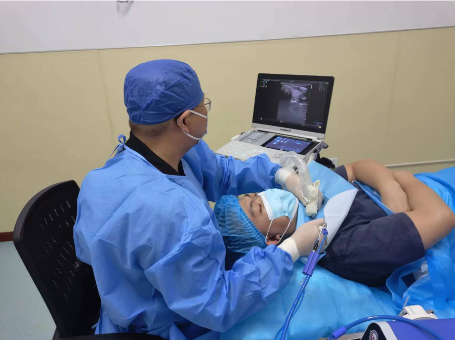 与传统手术相比,甲状腺结节消融技术无需全麻,只需局部麻醉,具有损伤小、恢复快、不留瘢痕、保留功能等优势,特别适合各种原因不能耐受全麻手术或具有美容需求的患者。其次,消融只针对甲状腺结节,不会损伤周边正常甲状腺组织,大大减少了术后甲状腺功能减退的发生,避免了可能由于终身服用药物对患者身心的影响,整个消融过程全程都在超声实时引导下可视化进行,可以很大程度避免因甲状腺周边血管、神经等重要组织器官损伤导致的出血、声音嘶哑等并发症。同时,结合超声造影技术可以很好的判定结节灭活程度,在避免风险的前提下做到结节充分完全灭活,保留局部腺体器官,患者短时间内就可以恢复正常工作和生活,提高了患者的生活品质。