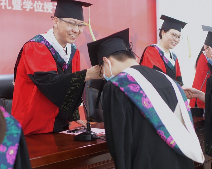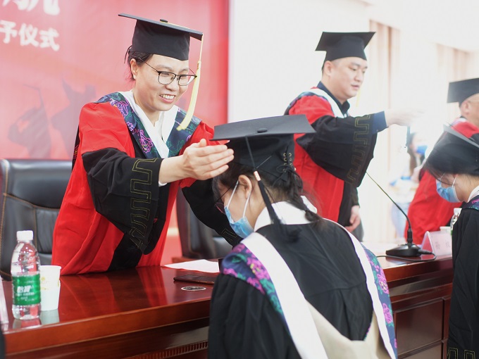 张根萍宣读学位评定委员会授予学位的决议并向同学们表示祝贺,毕业生依次上台,出席典礼的院领导和各位老师为他们授予学位证书并行拨穗礼。