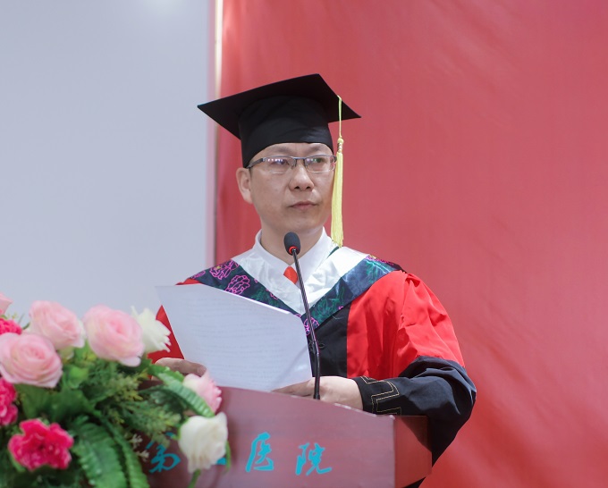随后,肖体君代表第二临床学院党政领导深情寄语2022届毕业生,用”一声祝贺、一句感谢、一份感慨“表达了对即将离校学子们的浓浓不舍之情。他指出,同学们的身上深深镂刻着邵阳学院的精神--明德、求真、共生、超越,毕业后,要坚守住中国传统知识分子的情怀--格物、致知、诚意、正心、修身、齐家、治国、平天下。希望同学们常怀感恩之情,常思报答之念,运用自己的平生所学,以仁义博爱之德行,服务患者,奉献社会,报效祖国,为人类、为社会、为守护生命和健康做出应有的贡献,以青春之姿投身伟大时代,做不负韶华不负时代的邵院人。