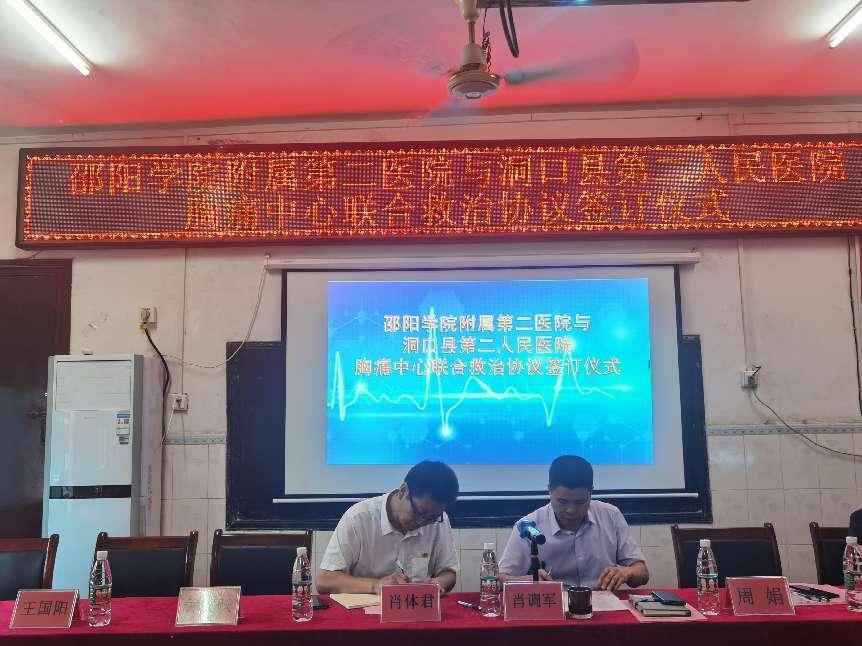 6月10日,邵阳学院附属第二医院党委委员、副院长肖体君前往洞口县第二人民医院,代表我院与洞口县第二人民医院正式签订胸痛中心联合救治协议。第二人民医院院长肖调军出席签约仪式。