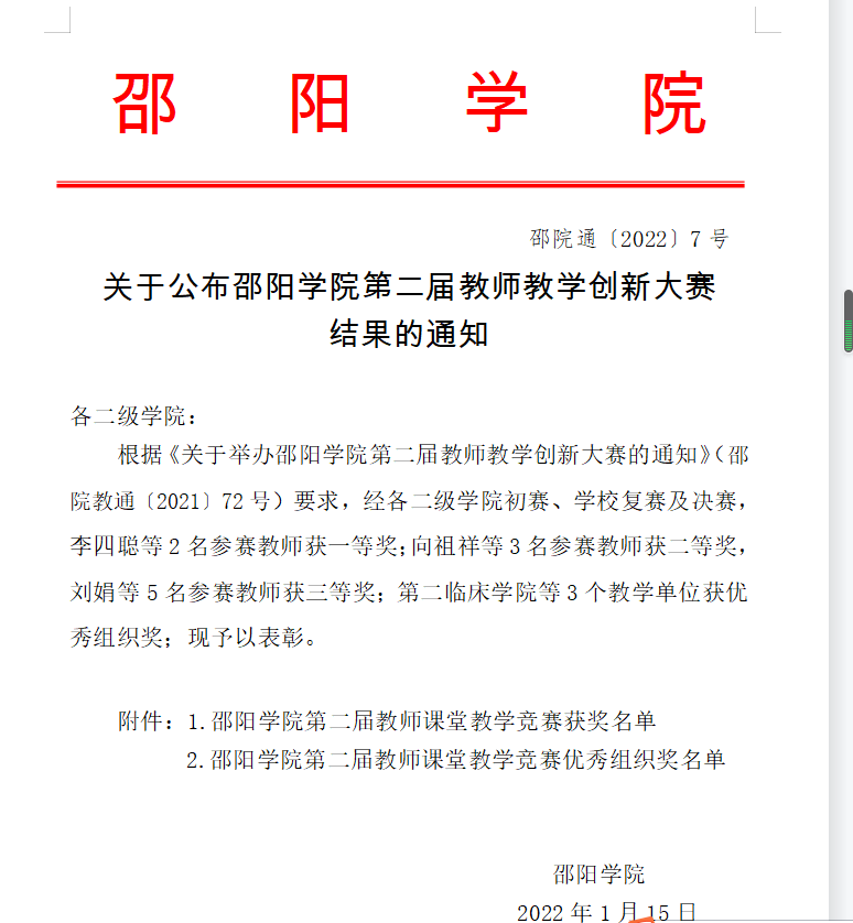 近日,学校正式发文公布了第二届教师教学创新大赛的结果。经过初赛、复赛、决赛层层筛选,激烈角逐,在1月10日的决赛中,第二临床学院(附属第二医院)三位老师脱颖而出,最终向祖祥老师荣获副高组二等奖,刘娟老师荣获副高组三等奖,黄梓龙老师荣获中级及以下组三等奖;同时,第二临床学院荣获本次大赛优秀组织奖。