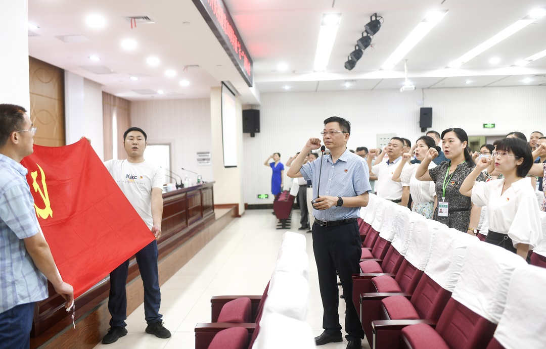 随着雄浑的国歌奏响,会议正式开始。首先,伍石华带领全体党员,右手握拳,面向党旗,庄严宣誓,重温入党誓词,坚定奋斗初心,入党使命。