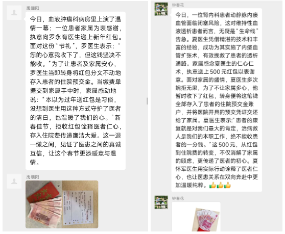 大年初一,血液肿瘤科医生罗永友就收到了一位患者阿姨送来的“新年红包”,他笑着婉拒:“您的心意我收下了,但这钱坚决不能收,你们早日康复,就是给我们最好的‘红包’、最浓的年味!”肾内科医生夏怀军为一名患者成功实施内瘘血管扩张术,保住了宝贵的透析通路,患者家属特意送来“感谢红包”,在多次婉拒无果后,为让家属安心,夏怀军暂时“收下”红包,随后立即将钱全部存入患者住院预交金账户。拒收红包已成为全院医护人员的自觉行动,他们以清廉行医、文明从医的作风,不断夯实医患信任桥梁,传递清风正气。