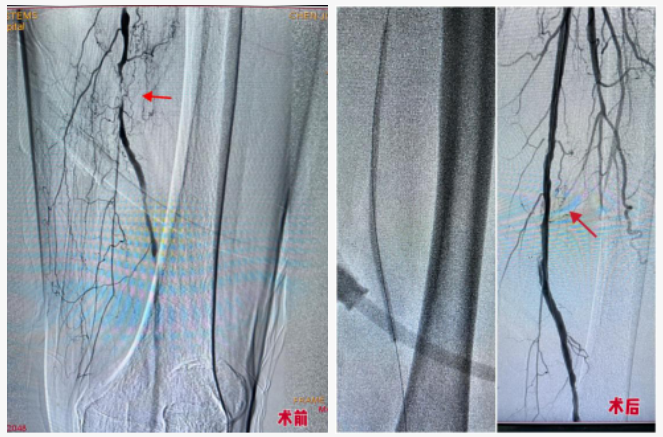 本例手术的核心难点在于患者病变血管存在严重钙化,范围从左侧股浅动脉中段延伸至腘动脉远端,这极大增加了腔内开通的难度和风险。朱席政主任团队凭借精湛技术和丰富经验成功完成了手术。