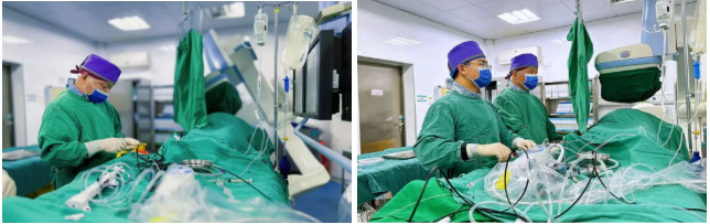 手术过程中,尹文跃主任、彭冠衡医师带领介入团队凭借精湛的技术、丰富的经验和默契的协作,沉着应对挑战。这场高难度的介入手术仅用时不到两小时便顺利完成。
