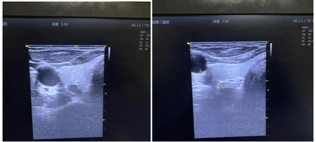 韩某某,男,52岁,维持性血液透析12年,出现骨痛、皮肤瘙痒等表现,外院诊断继发性甲状旁腺功能亢进,使用“帕立骨化醇、西那卡塞”等药物抑制甲旁亢,效果不佳,甲状旁腺素逐渐升高,为求治疗慕名来到我院肾内科就诊。查PTH 165 pmol/ml,B超检查发现两个增大的甲状旁腺,邵阳学院附属第二医院肾内科及风湿免疫科主任王兴健立即组织甲状腺及乳腺外科、麻醉科、心血管内科等多学科进行联合会诊,对患者进行全面评估,决定采用微创手术--甲状旁腺腺射频消融治疗。