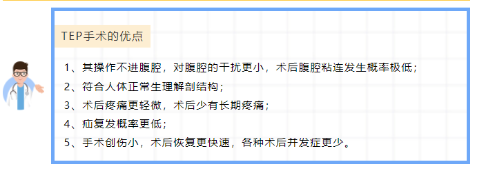 TEP更以其具有不进腹腔、不需缝腹膜,影响更小、并发症少、复发率更低等优点在经济发达地区已经广泛开展,成为治“疝” 利器。