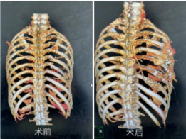 右侧多根肋骨骨折,其中4-8肋骨均有两处骨折,部分骨折端靠近脊柱,右侧胸壁塌陷明显。