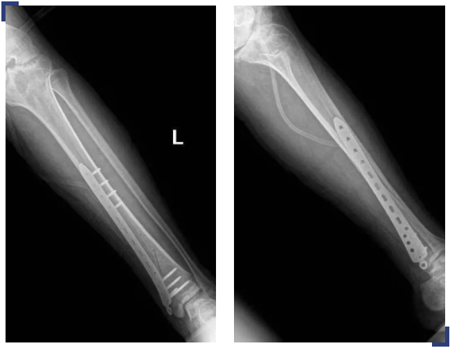 鉴于病人特殊,骨二科立即邀请血液肿瘤科(血友病治疗中心)会诊指导围术期血友病凝血因子管理。科室进行疑难病例讨论,对手术指征的把握、手术入路、固定方式、软组织的保护、如何减少术中术后出血、术后可能的并发症及如何预防等进行深入讨论。最终选择使用MIPO技术(微创钢板接骨术)对胫骨骨折进行复位,坚强固定,术前、术中、术后进行凝血因子的补充,可有效减轻软组织的损伤。术中仔细止血,减轻术后出血风险,术后早期功能锻炼。患者的右侧股骨外髁骨折无明显移位,予以保守治疗。
