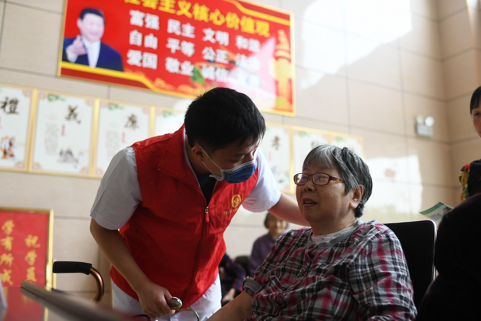 陶妮娜副主任为老年人量血压,