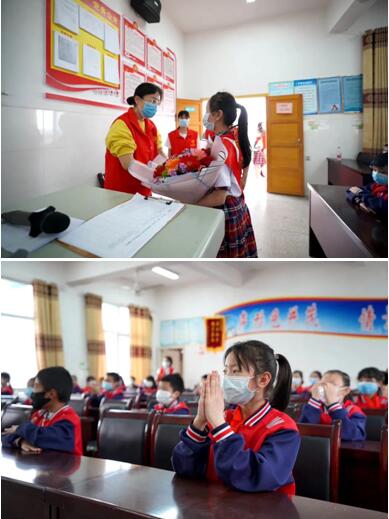 15时许,前进小学门口,孩子们用庄严的队礼欢迎援鄂抗疫英雄王青的到来。