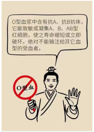 “0”型血是万能血的观念应该摒弃,因为O型红细胞上没有A、B抗原,所以O型红细胞可以在主侧配型相合时,给A、B、AB型的患者输注。但是,O型血的血浆中含有抗A抗体和抗B抗体,如果将含有O型血浆的红细胞制剂输入A、B、AB型患者的体内,将引起不同程度的免疫性溶血性输血不良反应。因此,非紧急情况下,应该以输入同型血为原则。