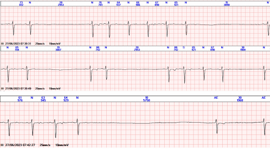 刘爷爷,因高血压、冠心病、心律失常20年,一直服用美托洛尔缓释片,近段时间感觉疲乏无力、阵发性头晕,早上起床后晕倒在地来我院就诊,动态心电图监测发现全天频繁出现大于3秒的心室停搏,早上07:42分晕厥再次发作时有长达5.7秒的心室停搏。遵医嘱逐渐减量、停药后再无晕厥发作,复查动态心电图正常。